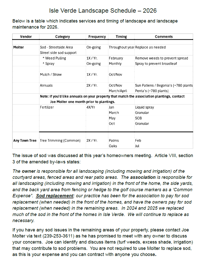 Landscaping: Common Areas are maintained weekly by Molter Landscaping. Lead on site contact is Jesus. · Issues or concerns – Contact David Garafola at PMI Gulf Coast Property Management 239-593-6246 or Joe Molter 239-253-3611