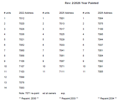 Note that the association fees include only painting and roof cleaning on the established 8-year cycle. If maintenance on the paint or roof cleaning (IE; in the event of mold) is required outside of the paint cycle, it needs to be scheduled and paid by the homeowner.